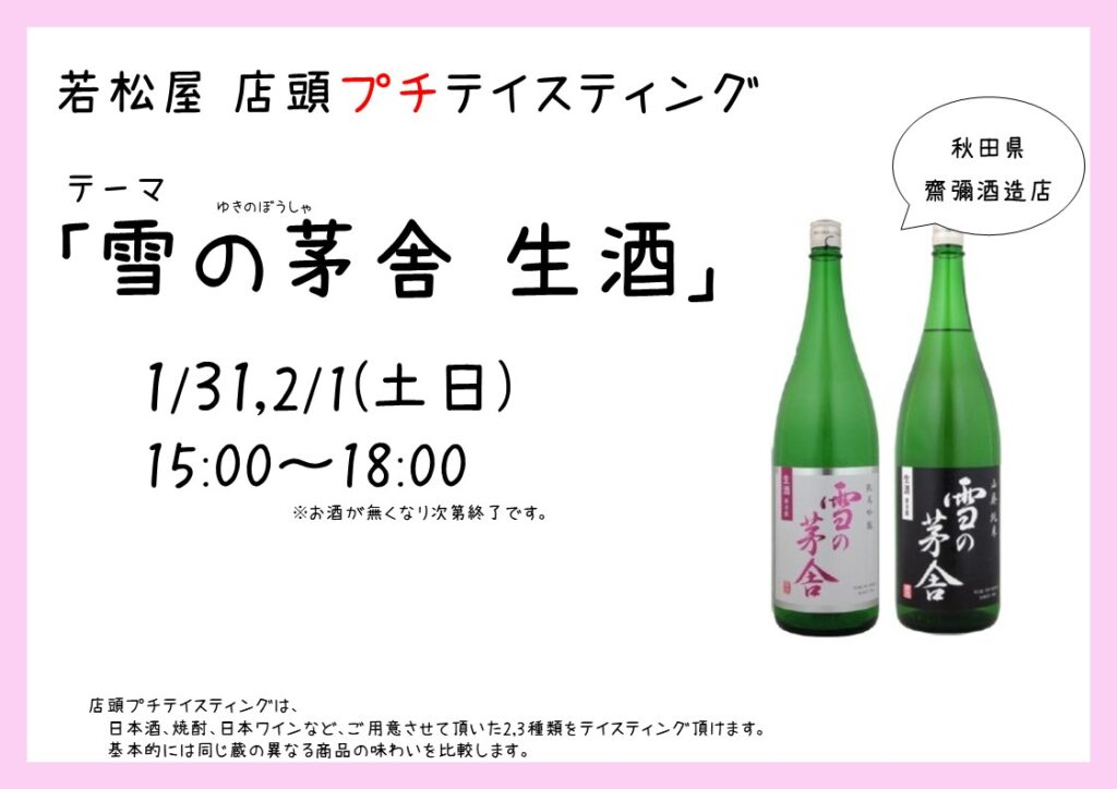 【店頭プチテイスティング】齋彌酒造店「雪の茅舎 生酒」開催です!