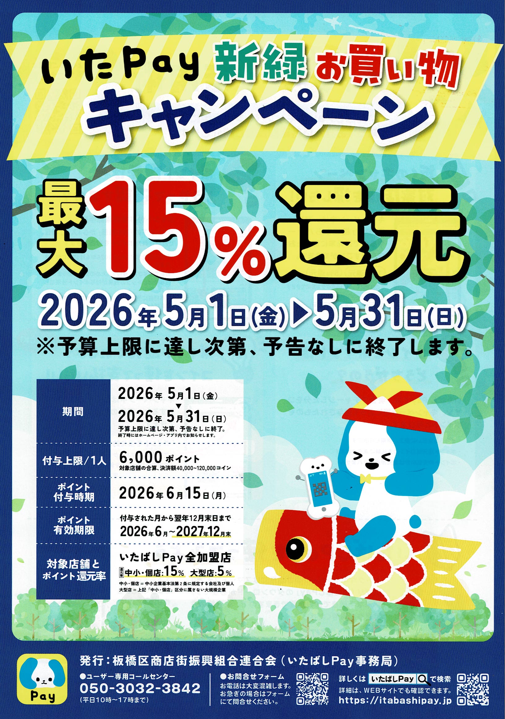 誰でも対象!【いたばしpay 15%ポイント還元】5月に開催です!