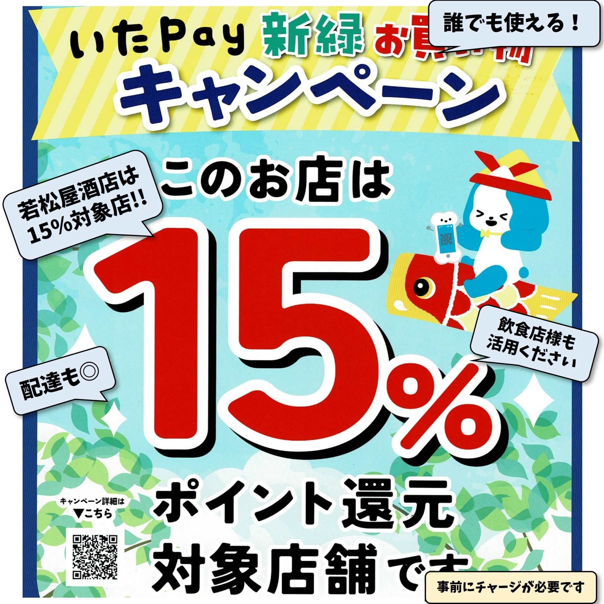 2026年5月は「いたPay新緑お買い物キャンペーン!」が開催!若松屋酒店は15%還元対象店舗です(^^)/